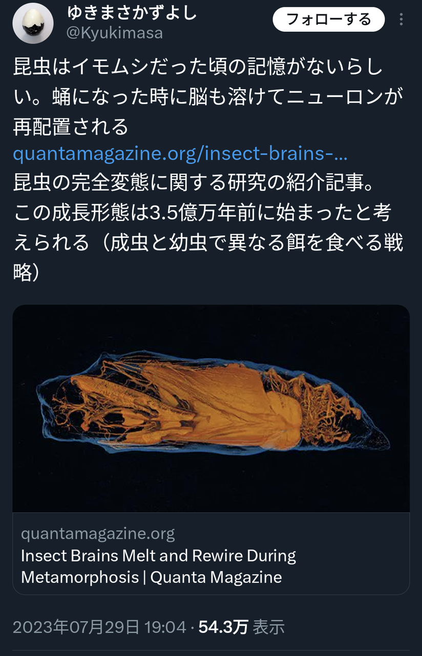 【悲報】昆虫さん、イモムシだったころの記憶がなかった 2023年07月31日 カテゴリ:自然・生き物 1: 2023/07/29(土) 22:04:39.11 ID:vvuROjrKdNIKU 2: 2023/07/29(土) 22:05:53.87 ID:zUzRz+XI0NIKU 完全変態とかいうパワーワード 【【悲報】昆虫さん、イモムシだったころの記憶がなかった】の続きを読む タグ :#昆虫