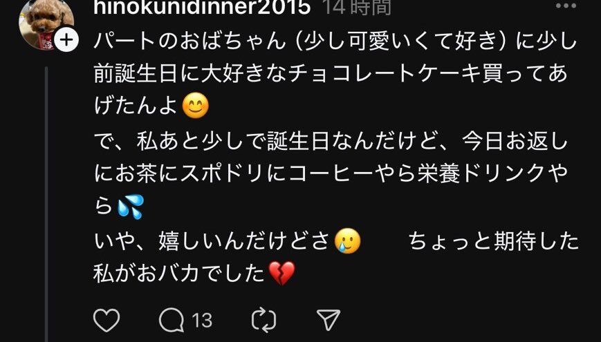 経営者「パートのおばちゃんの誕生日にケーキあげたけどお返しがショボい。期待した俺がバカじゃん」 2025年09月30日 カテゴリ:雑談 1: 2025/09/27(土) 09:27:00.79 ID:svb5ePksd 【経営者「パートのおばちゃんの誕生日にケーキあげたけどお返しがショボい。期待した俺がバカじゃん」】の続きを読む