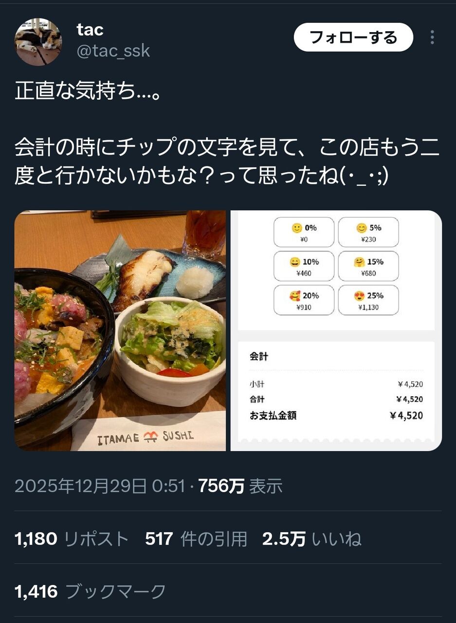 【悲報】チップ制を導入した飲食店、エックスでボロクソに叩かれてしまう