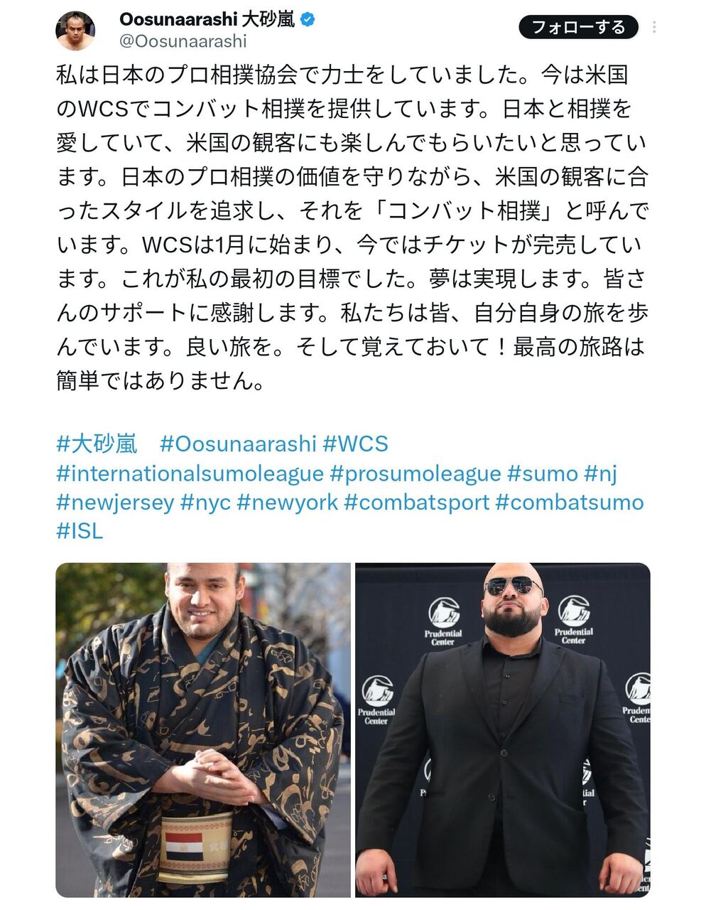 私は日本のプロ相撲協会で力士をしていました。今は米国のWCSでコンバット相撲を提供しています。日本と相撲を愛していて、米国の観客にも楽しんでもらいたいと思っています。日本のプロ相撲の価値を守りながら、米国の観客に合ったスタイルを追求し、それを「コンバット相撲」と呼んでいます。WCSは1… pic.twitter.com/vb95Qn9ZKm