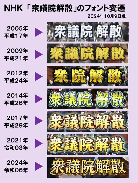 NHKの衆議院解散テロップの歴代フォント2024年版を作りました。#衆議院解散 pic.twitter.com/BBYj5gGouJ