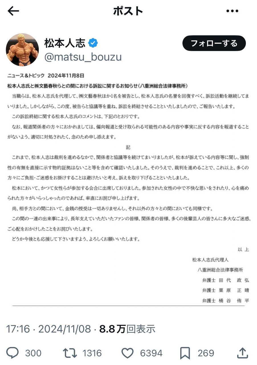 勘違いしてるやついるけど、松本が提訴を下げてあげたってだけで裁判に勝てないとかそういう話じゃねーからな
