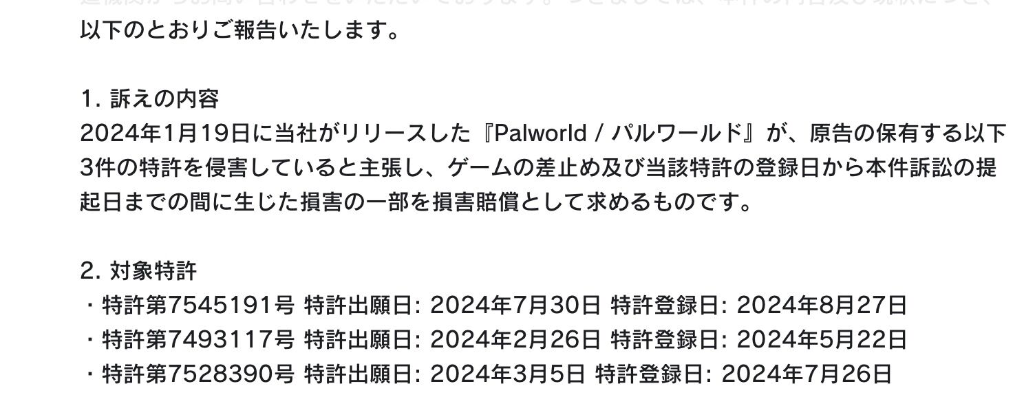 任天堂および株式会社ポケモンは9月19日にポケットペアを『Palworld / パルワールド』を特許侵害で提訴。一方で詳しい内容は明かされておらず、ポケットペアは訴状がまだ届いていないとしていた。そしてこのたび、ポケットペア側の開示によって、詳細が明らかになった。