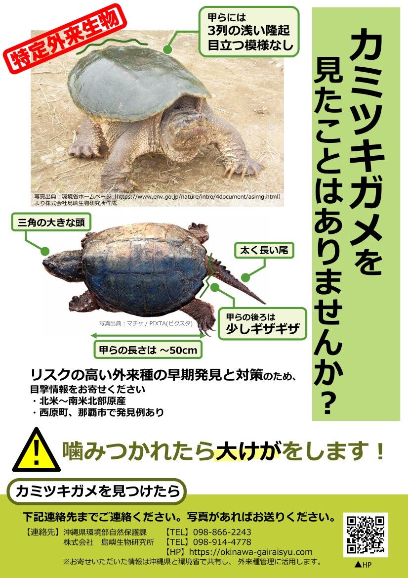 岐阜県によりますと去年10月、美濃市内で特定外来生物であるカミツキガメの疑いがある体長およそ28センチのカメを近くに住む人が見つけ、県職員が引き取りました。