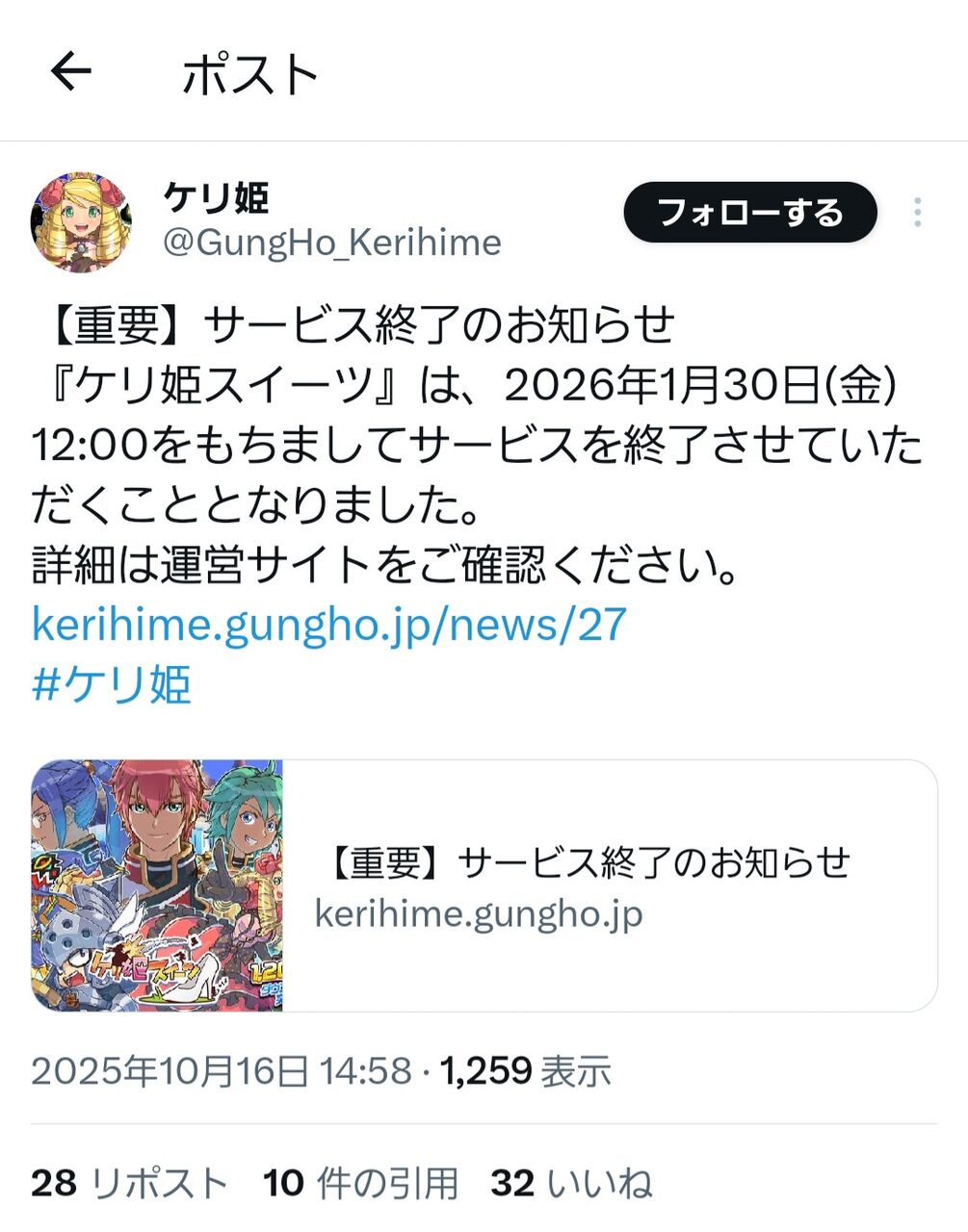 2012年11月のサービス開始より、多くの皆様にお楽しみいただいておりました「ケリ姫スイーツ」でございますが、この度2026年1⽉30⽇(金) 12:00をもちまして、サービスを終了させていただくこととなりました。