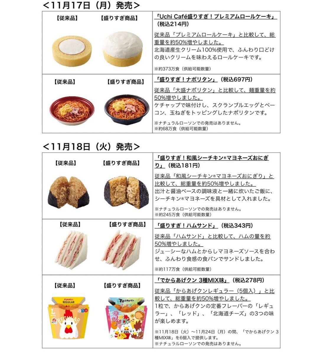 【ローソン】 約50%増量の盛りすぎチャレンジが開催✨ 11月17日から 『Uchi Café盛りすぎ!プレミアムロールケーキ』 『盛りすぎ!ナポリタン』 11月18日から 『盛りすぎ!和風シーチキン®マヨネーズおにぎり』 『盛りすぎ!ハムサンド』 『でからあげクン 3種MIX味』 11月24日から