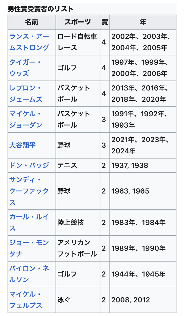 AP通信 年間最優秀男性アスリート賞