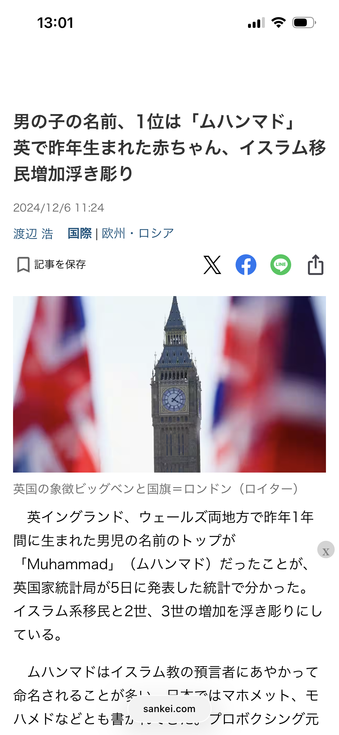イギリス2023の新生児の名前ランキング1位はムハンマドだぞ
