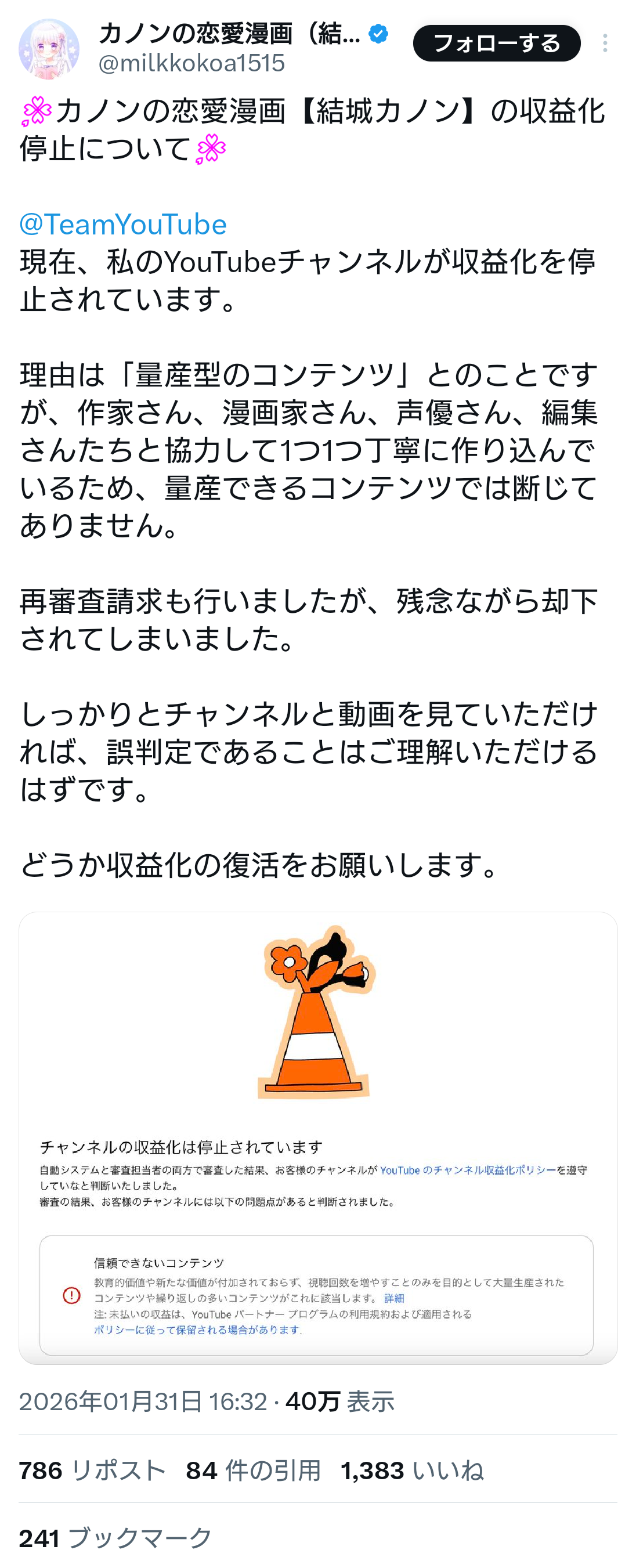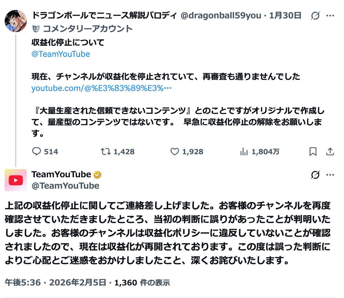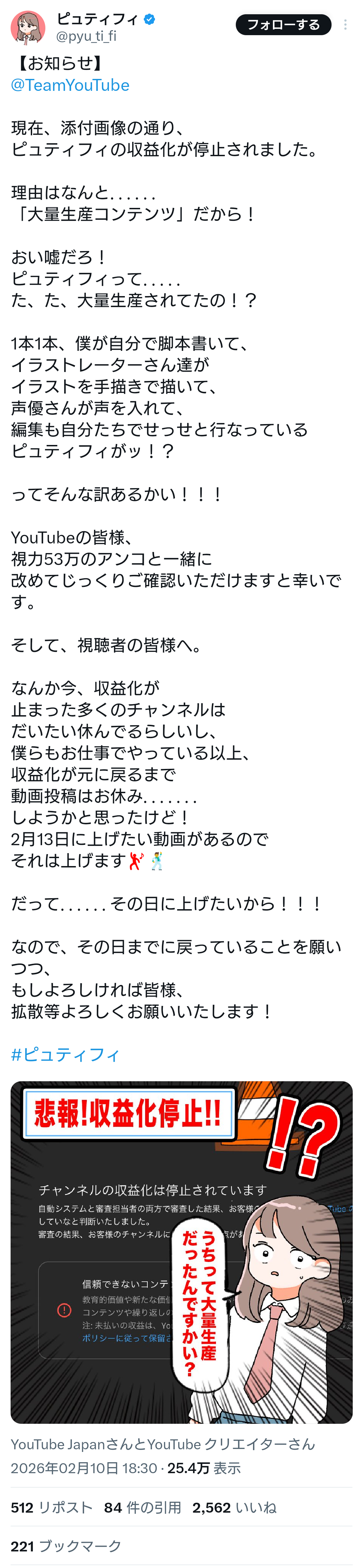 根こそぎにするのに取り敢えず停止しまくって後から個別で対応するんやろ。量産型はYouTubeにそれだけ嫌がられてるんやな