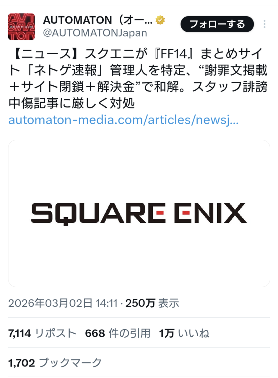 スクエニは手間も金もかかっても普通に訴訟したほうが良かったと思うんだよな