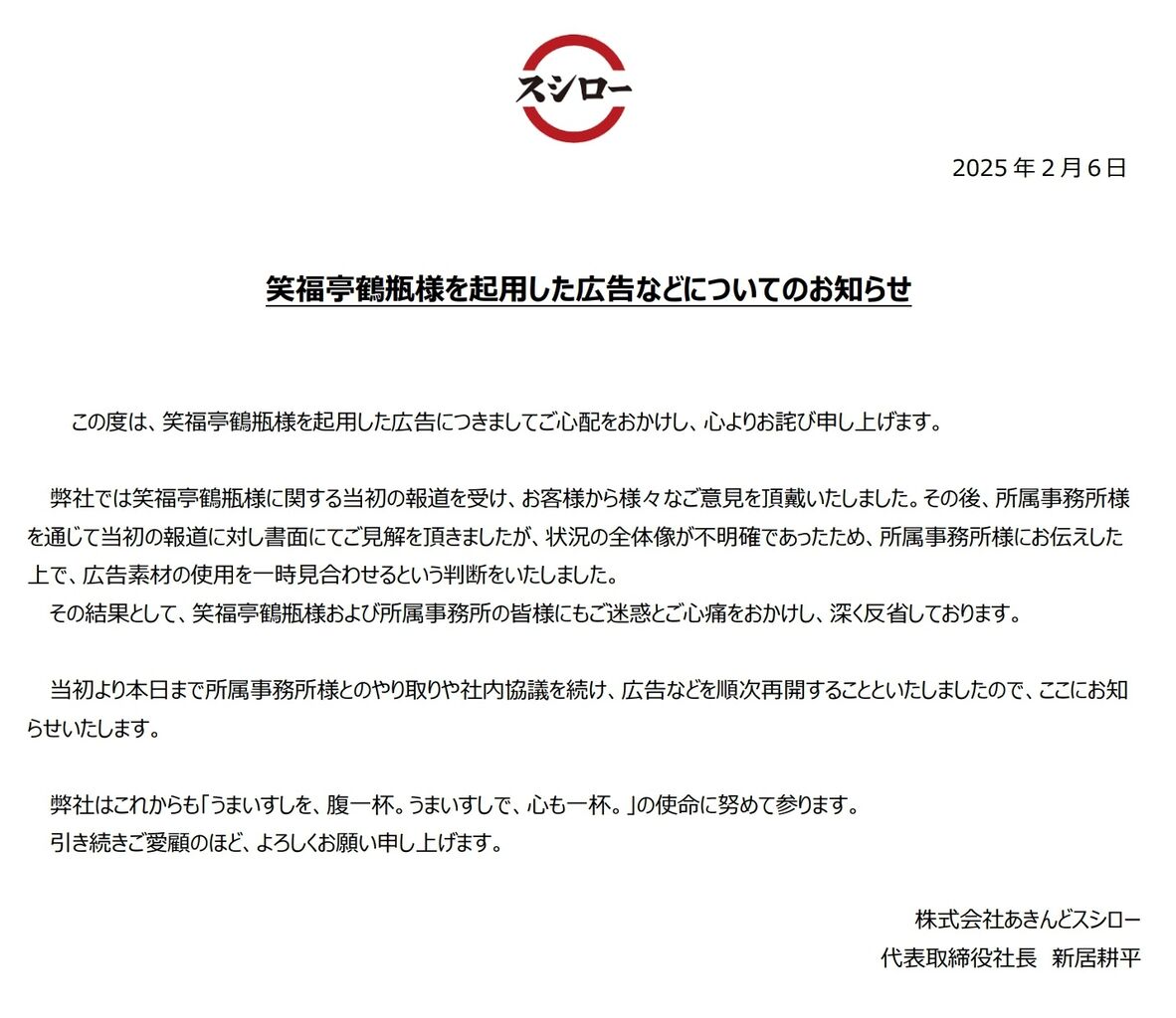 スシロー、笑福亭鶴瓶の広告を順次再開へ 公式サイトから削除の経緯説明&謝罪も「ご迷惑とご心痛をおかけし、深く反省」