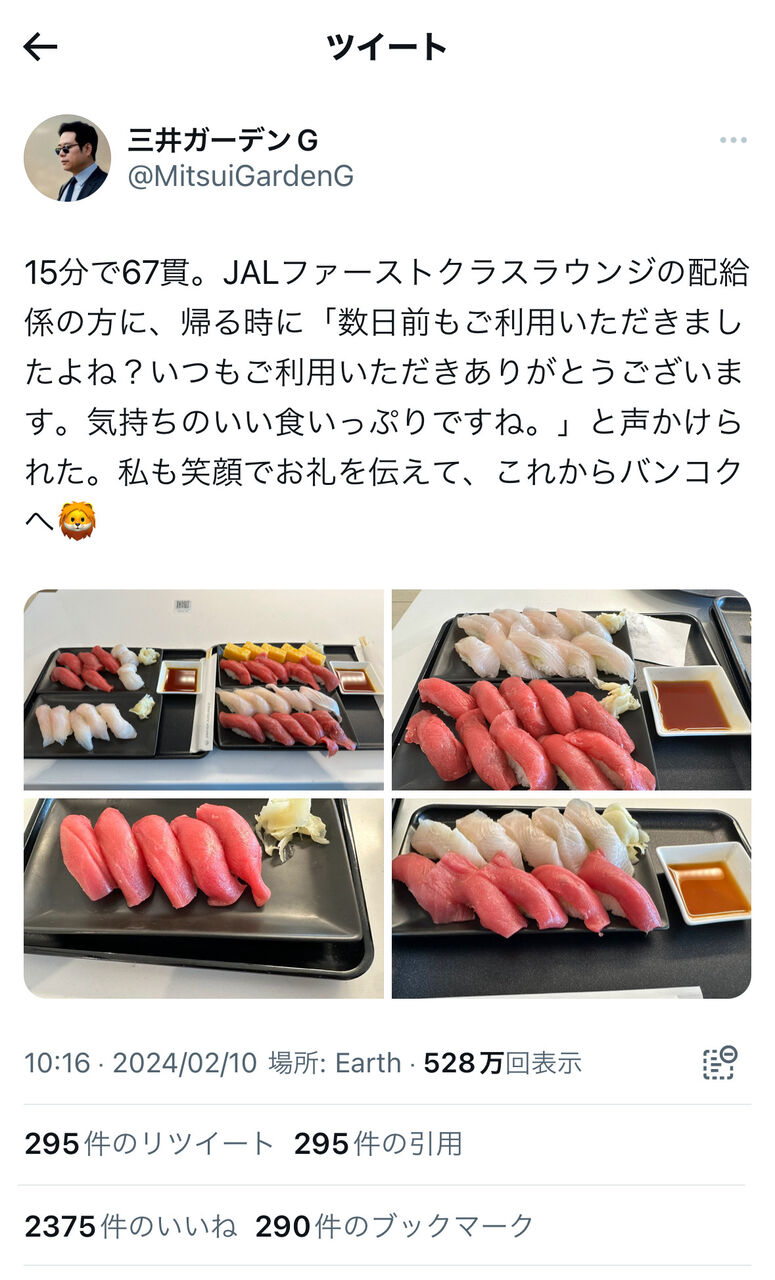 15分で67貫。JALファーストクラスラウンジの配給係の方に、帰る時に「数日前もご利用いただきましたよね?いつもご利用いただきありがとうございます。気持ちのいい食いっぷりですね。」と声かけられた。私も笑顔でお礼を伝えて、これからバンコクへ🦁 pic.twitter.com/QOLsKIWfwJ