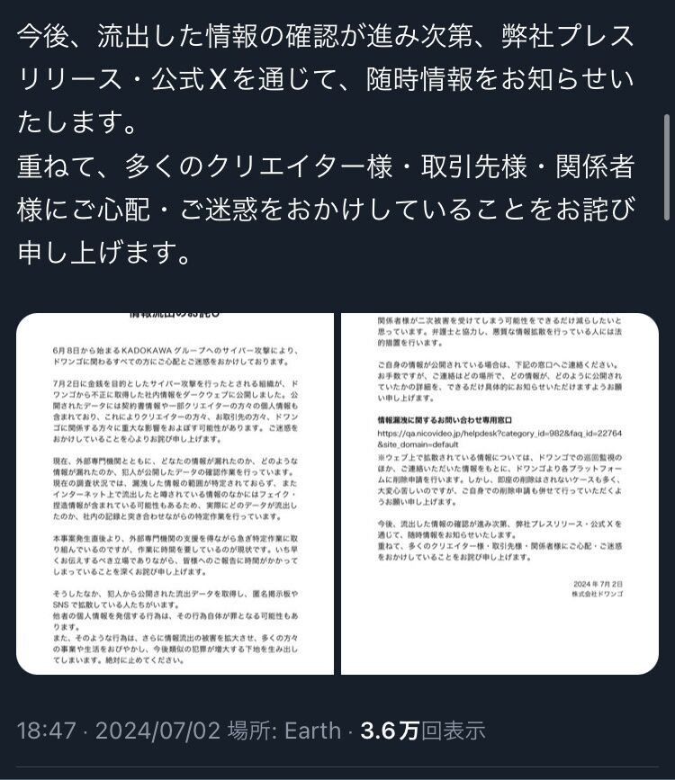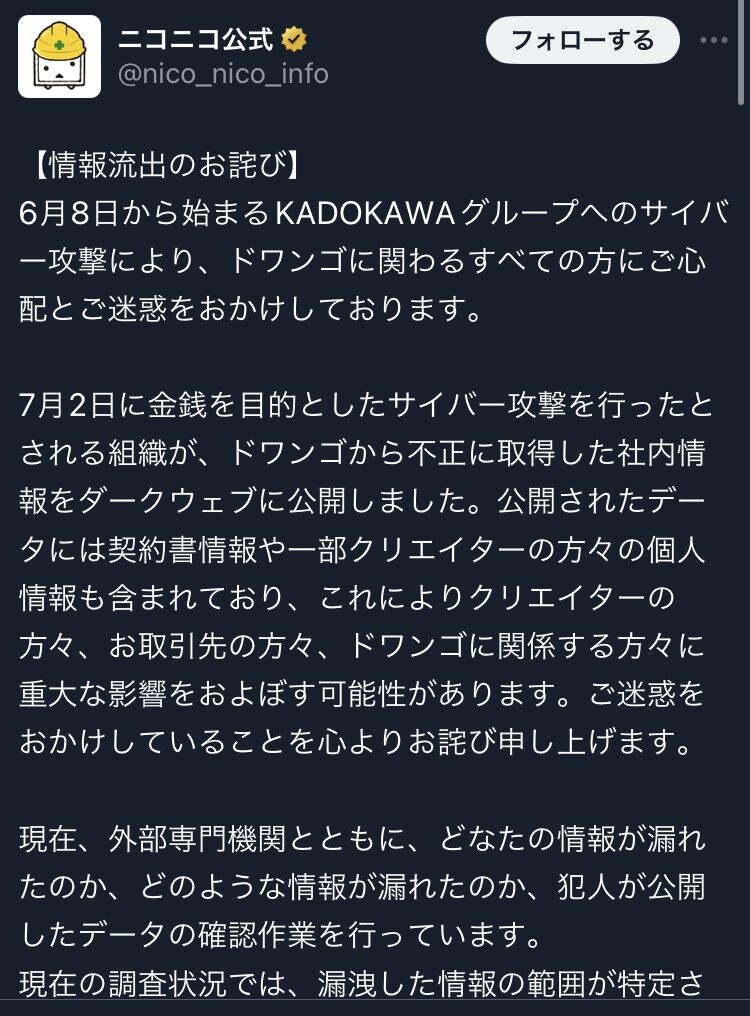 ドワンゴ、流出したデータを拡散するネット民にブチ切れwwwwwwwwww 2024年07月04日 カテゴリ:話題企業・サービス 1: 2024/07/02(火) 19:18:18.68 ID:A9/dEsZFd 【ドワンゴ、流出したデータを拡散するネット民にブチ切れwwwwwwwwww】の続きを読む タグ :#ドワンゴ#KADOKAWA#ニコニコ動画#サイバー攻撃#ハッキング
