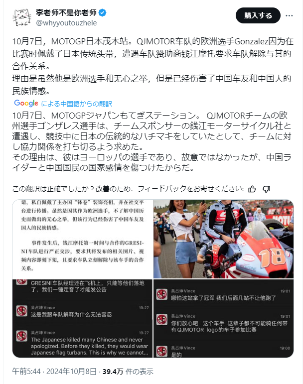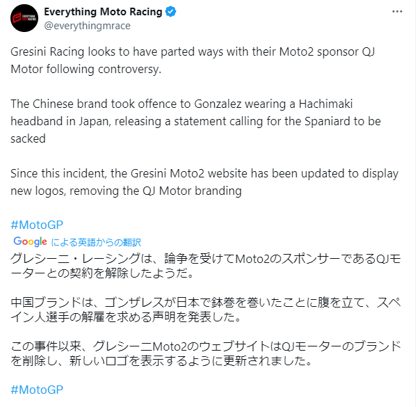 伊バイクレーサー、日章旗の鉢巻を付ける→中華がブチギレて解雇要求→チーム「お前が消えろ」 2024年10月13日 カテゴリ:海外 1: 2024/10/12(土) 22:34:26.57 ID:MKBBux+/0 motoGP moto2優勝を果たしたイタリア・グレシーニレーシングのゴンザレスは、日本のもてぎカップにて 優勝した際に日本の国旗を描いたハチマキを着用した。 グレシーニレーシング筆頭スポンサーである中国のQJモータースはこれに対して激怒し 「日本の軍国主義を想起させるため、早急にゴンザレスの解雇を要求せよ」と表明した。 それに対してグレシーニレーシングは本日、以下のように表明した。 「イタリア・グレシーニレーシングは本日をもってQJモータースとのスポンサー提携を解除する。」 「この要求は全く不当なもので、サーキットに政治思想を持ち込むものだ」 「そもそも現在進行形で弾圧に加担している国家が要求してよいものではない」 これによって筆頭スポンサーを失ったグレシーニレーシングは QJグレシーニからグレシーニへとチーム名が変更となる。 なお、ゴンザレス選手は今期限りで別チームへの移籍が決定しており グレシーニレーシングにゴンザレス選手を守る理由は薄く 更にメインスポンサーを失うほどの判断を下すのは相当な大事だということを付け加えておく。 【伊バイクレーサー、日章旗の鉢巻を付ける→中華がブチギレて解雇要求→チーム「お前が消えろ」】の続きを読む タグ :#イタリア#中国#バイク#MotoGP