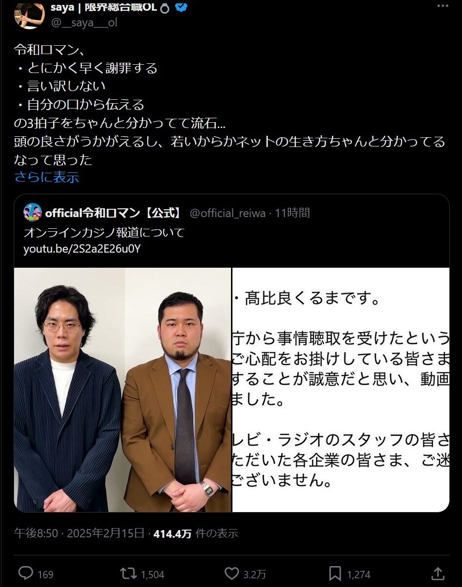 28日、吉本興業がオンラインカジノ賭博問題で、活動を自粛していた『令和ロマン』の髙比良くるまさんとのマネジメント契約終了を発表しました。