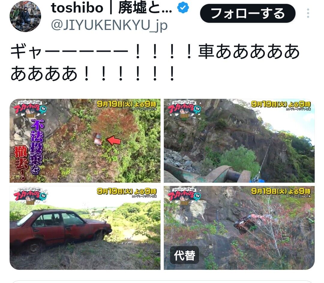 【悲報】廃墟マニアに人気の廃車、テレビ番組が勝手に撤去し大炎上する 2023年09月16日 カテゴリ:話題 1: 2023/09/15(金) 07:04:20.38 ID:qAuWcAr/r 4: 2023/09/15(金) 07:05:45.41 ID:hGZsyHNXr ゴミ片付けただけやん 【【悲報】廃墟マニアに人気の廃車、テレビ番組が勝手に撤去し大炎上する】の続きを読む タグ :#廃墟