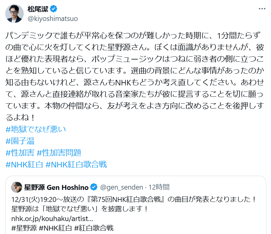【悲報】星野源さん、紅白で園子温絡みの曲をやると発表したら大炎上してしまうwwwwwwwww 2024年12月25日 カテゴリ:芸能・有名人 1: 2024/12/24(火) 00:59:40.42 ID:2DeSkcbX0EVE 日本では周回遅れのキャンセルカルチャー花盛り 【【悲報】星野源さん、紅白で園子温絡みの曲をやると発表したら大炎上してしまうwwwwwwwww】の続きを読む タグ :#星野源#園子温#紅白歌合戦